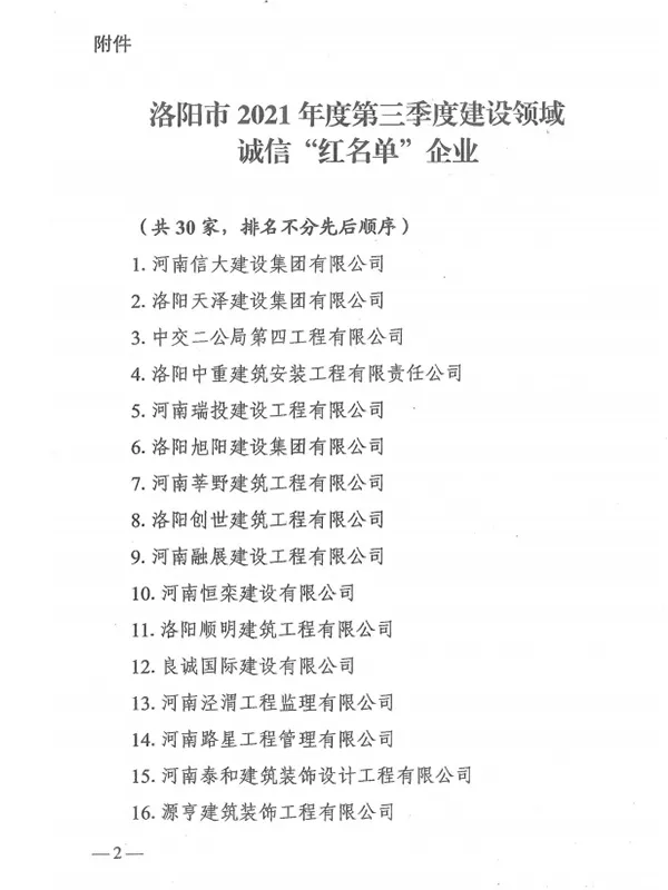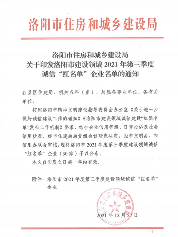 我公司被评为洛阳市2021年度第三季度“建设领域诚信‘红名单’企业